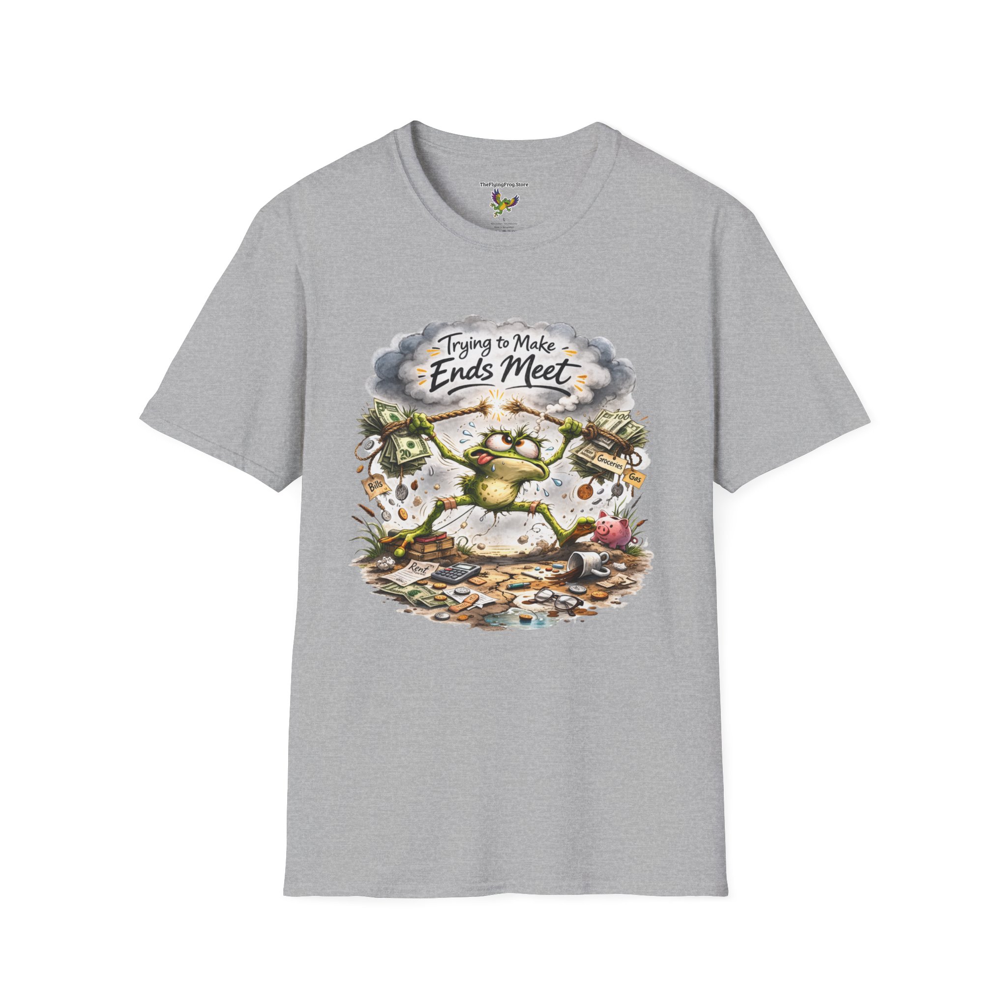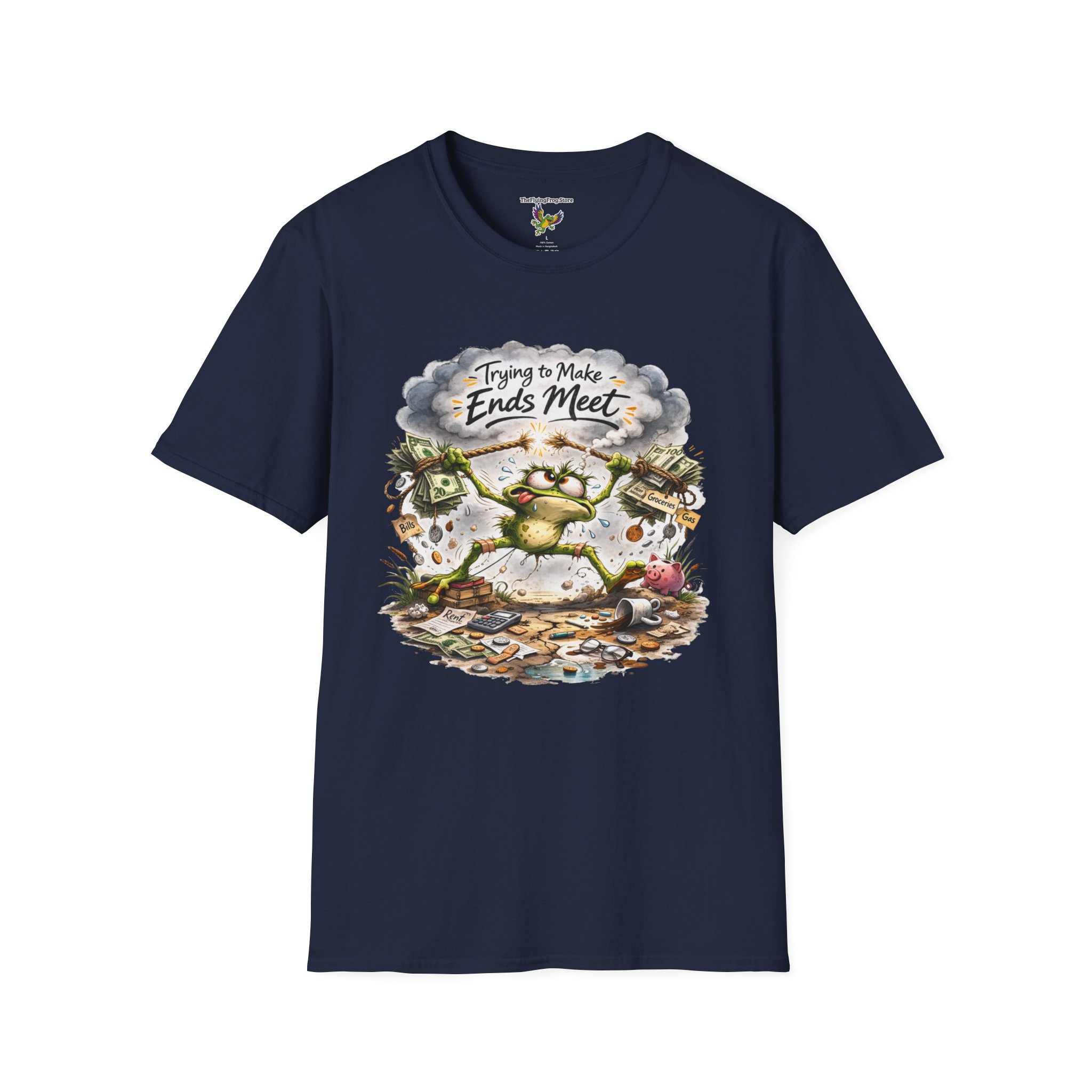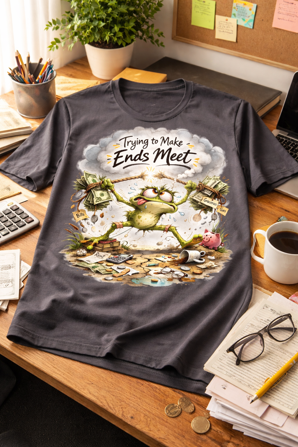The Trying to Make Ends Meet frog shirt captures real-life budget stress with humor and personality. It features a detailed frog design that shows the struggle of stretching every dollar.